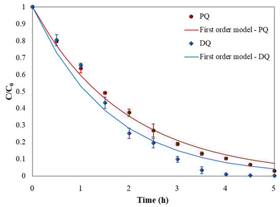 Pseudo-first-order model applied to the degradation kinetics of PQ and DQ.