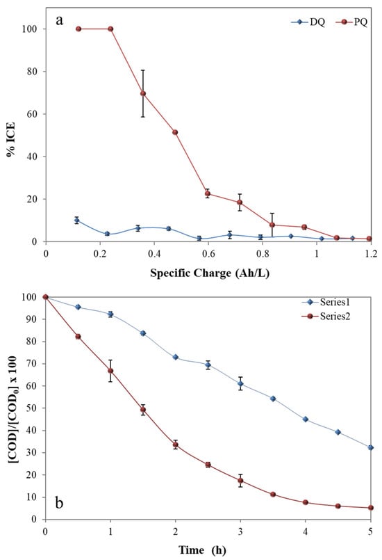 The evolution of (a) %ICE as a function of specific charge (Ah/L), and (b) COD as a function of time, during the treatment for DQ and PQ. Conditions: (a) 0.650 L of a 70 mg/L DQ solution in 0.05 M Na2SO4 at 1.47 mA/cm2, and (b) 0.650 L of a 73 mg/L PQ solution in 0.05 M Na2SO4 at 1.55 mA/cm2.