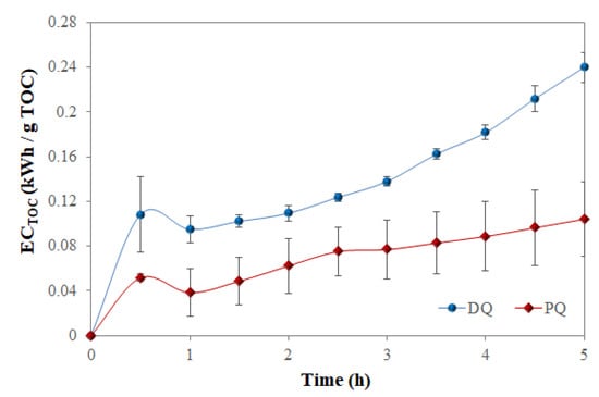 On the other hand, energy consumption (kWh) per gram of TOC removed (ΔTOC) during the degradation period is given by the following expression [52]: