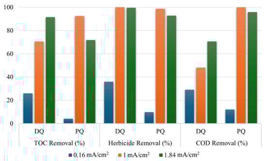 Effect of current density on degradation efficiency for DQ and PQ: TOC, concentration removal, and COD ([DQ]0 or [PQ]0: 60 mg/L, volumetric flow: 500 mL/min).