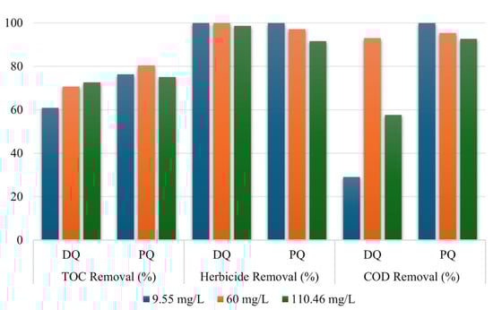 The initial concentrations of PQ and DQ, ranging from 10 to 110 mg/L, were selected to study their influence on removal efficiency. Increasing PQ concentration did not significantly affect its removal rate, which remained around 100%. Additionally, TOC removal (i.e., mineralization) increased proportionally with the concentration up to 90 mg/L (Figure 10a,b). However, concentrations beyond this threshold resulted in diminished TOC removal, with a 12% reduction (from 83 to 71%, Figure 10a).