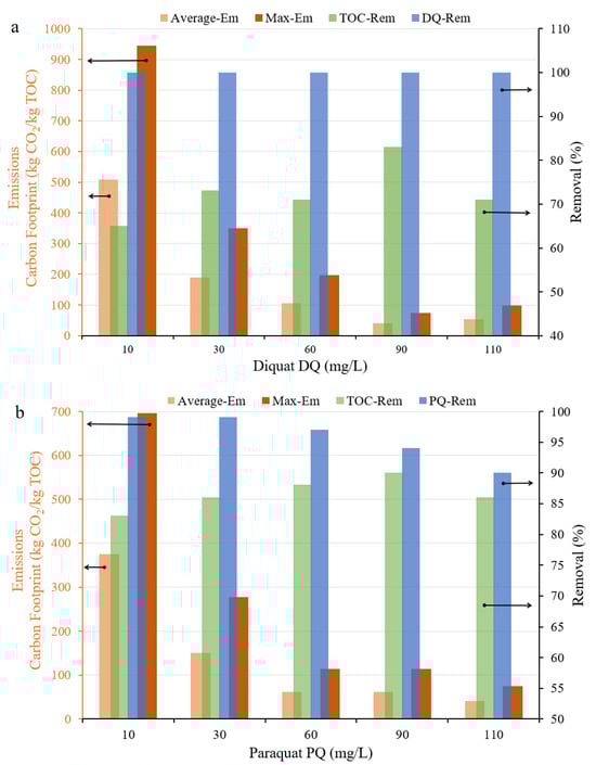 Impact of herbicide concentration on overall process performance. (a) Diquat (DQ) and (b) paraquat (PQ).