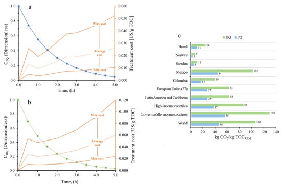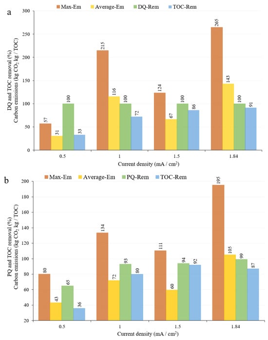 Considering the global average for electricity generation (61% from fossil fuels, 9% from nuclear, and 30% from renewables), the electrooxidation treatment of PQ and DQ could result in emissions of around 2.7 and 38.9 kg CO2/m3 of water treated, respectively. These values align with the literature reports of emissions ranging from 2 to 50 kg CO2/m3 and treatment costs between USD 2 and USD 50 per cubic meter [72]. If renewable energy sources are used, the emissions could be significantly reduced to 0.28 kg CO2/m3 for PQ and 0.40 kg CO2/m3 for DQ.