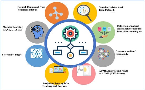 Failures resulting from poor absorption, toxicity, adverse effects, or ineffectiveness in in vivo, in vitro, and in silico research use computer methods to predict the desired activity (drug-likeness), toxicity, absorption, distribution, metabolism, and excretion of lead compounds from the library of chemicals that is already available [16,17]. In this research, we applied ML to the ADME dataset of C. intybus to develop and compare the performance of various ML models (SVM, RF, NB, and DT) in predicting ADME properties within the plant’s chemical dataset. This research will contribute to improving prediction models for ADME assessment using canonical SMILES.