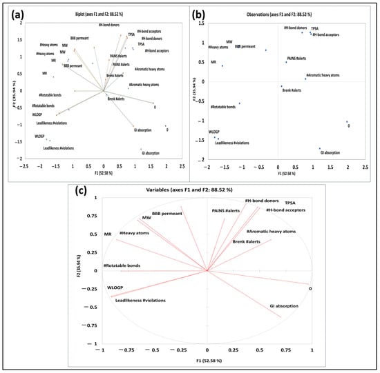 (a) Biplot representing metabolites’ different AME properties of the selected phytomolecules from plant, (b) observation on vector scale in PCA analysis, (c) PCA of the ADME dataset sample; factor F1 contributes 52.580% and F2 contributes 35.94% wattage to dataset.