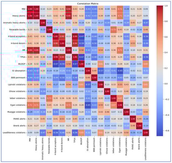 Correlation analysis is a statistical method used to evaluate the strength and direction of the linear relationship between two quantitative variables, resulting in a correlation coefficient that ranges from −1 to +1 [33]. From the heatmap correlation matrix, we observe that the ADME dataset of the plant has strong positive correlation between the MW and heavy atoms. MR is represented with a red color, whereas H-bond acceptors, H-bond donors, TPSA, and Veber violations show moderate correlation with MW. Other factors, however, such as aromatic heavy atoms, rotatable bonds, WLOGP, and Lipinski violations, show moderate correlations with MW variables (Figure 4).