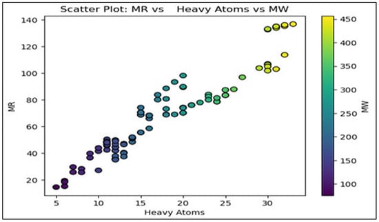 The heatmap analysis color scheme indicates the strength and direction of correlations: blue represents a negative correlation, light brown indicates a weak correlation, dark brown shows a moderate positive correlation, and red signifies a strong positive correlation. Additionally, the most correlated ADME properties are further investigated by plotting a scatter plot between MR and heavy atoms and MW. From the above correlation, it can be seen that features like heavy atoms and MR have a strong correlation with MW (Figure 5).