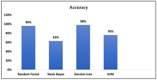 Comparison of developed models in terms of accuracy. DT shows highest accuracy, followed by RF and SVM and lowest accuracy for NB.
