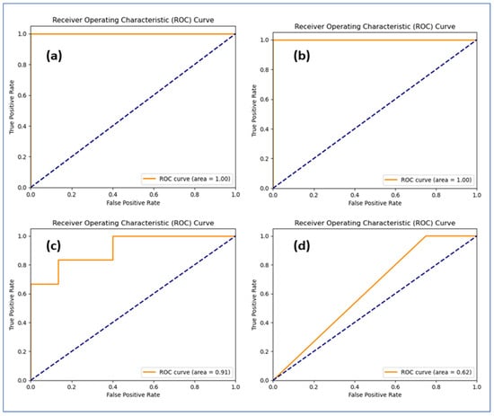 ROC curve for (a) random forest, (b) decision tree, (c) SVM, and (d) NB.