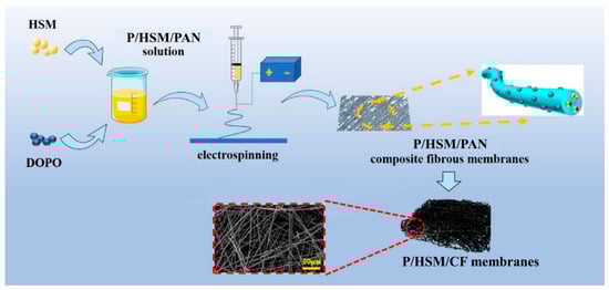 Fabrication of P/HSM/PANs: The electrospinning technique was applied to prepare P/HSM/PANs. Since the chemical reaction between wood and DOPO is difficult to achieve, resulting in poor durability and volatilization of DOPO prior to combustion. Increased DOPO concentration improved fire retardancy but reduced reactivity and thermal and mechanical properties. In this work, we chose DOPO concentrations of 5.0, 9.0, and 13.0 wt.% to investigate the fire retardancy and mechanical properties of composites. Given amounts of DOPO (5.0 wt.%, 9.0 wt.%, 13.0 wt.%) and HSM (1.0 wt.%) were dispersed in PAN electrospinning solution with ultrasonic treatment of 30 min and continuous stirring of 10 h. Electrospinning was carried out using a single-axis needle electrostatic spinning device. The specific process parameters were set as 20 kV of voltage, 12 cm of receiving distance, and 0.8 mL/h of feeding rate. As-prepared electrospun P/HSM/PAN films were vacuum-dried at 80 °C for 24 h. P/HSM/PAN films were termed as P/HSM/PAN-1, P/HSM/PAN-2, and P/HSM/PAN-3 according to the sequence of DOPO amount.