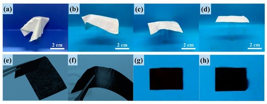 The actual photos of HSM/PAN, P/HSM/PANs, HSM/CF, and P/HSM/CF membranes are exhibited in Figure 2. HSM/PAN and P/HSM/PANs presented smooth surfaces, fine texture, and pure white color. HSM/PAN, P/HSM/PAN-1, P/HSM/PAN-2, and P/HSM/PAN-3 were naturally placed on a cylindrical shelf for macroscopic morphology observation (the center of each membrane coincided with the center of the shelf). HSM/PAN membrane without the addition of DOPO could naturally hang down and cover most of the shelf. With the increase in DOPO content, P/HSM/PAN membranes tended to be firm gradually and their flexibility was lower than that of HSM/PAN membranes, showing a certain rigidity.