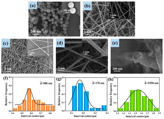 Microscopic morphologies of HSM (a), P/HSM/CF-1 (b), P/HSM/CF-2 (c), P/HSM/CF-3 (d), and P/HSM/CF-2 cross-section (e). Diameter distribution of P/HSM/CF-1 (f), P/HSM/CF-2 (g), and P/HSM/CF-3 (h).