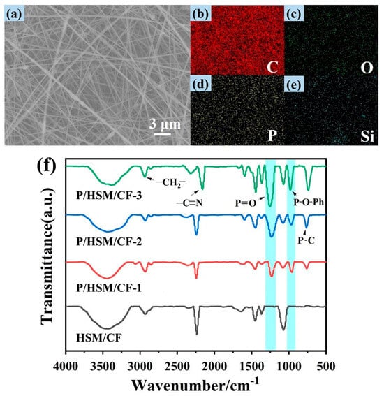 The uniform distribution of compositions in flame retardant composite is crucial to ensure stable flame retardant performance. Taking P/HSM/CF-2 as an example, the elemental analysis of this composite fiber membrane was carried out via the energy spectrum analyzer. As shown in Figure 4a–e, four elements C, O, P, and Si were dominant in the fiber film, in which P was derived from the flame retardant DOPO and Si was derived from the adding HSM. From the mapping distribution of P, it can be seen that the flame retardant was evenly distributed in the fiber film, which was of great significance to realize the stable flame retardant performance of the fiber film.