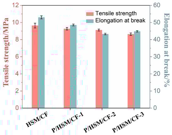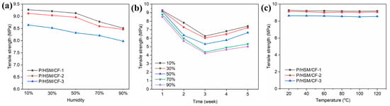 As shown in Figure 7a, the tensile strengths of P/HSM/CF-1, P/HSM/CF-2, and P/HSM/CF-3 continued to decrease with increasing environmental humidity from 10% to 90%. As shown in Figure 7b, tensile strengths of P/HSM/CF-1 stored at the environmental humidity of 10–90% presented a declining trend as the storage time increased to 3 weeks. As the storage time increased from 3 weeks to 5 weeks, tensile strengths of P/HSM/CF-1 stored at the environmental humidity of 10–90% showed a rising trend. As shown in Figure 7c, tensile strengths of P/HSM/CF-1, P/HSM/CF-2, and P/HSM/CF-3 remained stable as the environmental temperature increased from 20 °C to 120 °C [,,,].