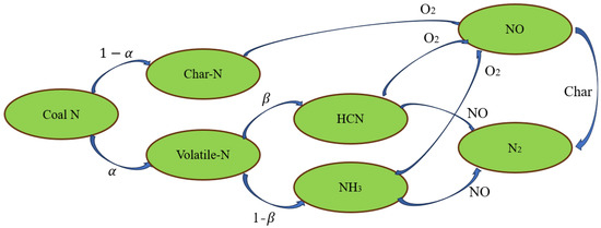 The NOx produced by pulverized coal combustion mainly includes prompt NOx, thermal NOx, and fuel-based NOx. The prompt NOx content is extremely low, and generally not considered [35]. The formation mechanism of fuel-based NOx is displayed in Figure 1. The concentration distribution of NOx is calculated after the calculation of the heat state in the furnace in this study.