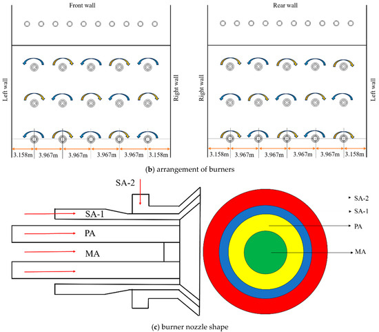 This study mainly focuses on a 600 MW supercritical pressure, once-through boiler. The boiler adopts one single furnace and a Π-type layout. Its combustion system applies 30 low-NOx axial swirl burners, symmetrically arranged. Figure 2 depicts a schematic representation of the furnace structure along with the arrangement of the burners.