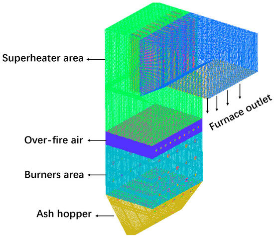 This study employs ICEM for meshing the geometric structure and performs grid refinement in the burner area to make the grids more suitable for describing the combustion process, as depicted in Figure 3. As the count of grids increases, the accuracy of the numerical simulation escalates. However, excessive grids provide only a limited improvement in accuracy and increase computational costs. Therefore, three sets of grids with varying quantities are chosen by selecting different levels of grids in the burner area, which are 1.50 million, 1.95 million, and 2.89 million grids, respectively. These grid schemes are employed to conduct the numerical studies at under 100% BMCR.