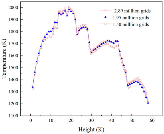 During the grid independence validation process, the average temperature taken across the furnace height’s cross-sectional direction is adopted as the key metric. Figure 4 showcases the temperature profile along the furnace’s vertical axis under three distinct grid configurations. As is evident from the graphical depiction, notable temperature fluctuations are discernible within the burner zone, primarily attributed to the ingress of secondary air into the furnace, subsequently diminishing the cross-sectional average temperature at that location. As the number of grids increased from 1.95 million to 2.89 million, there was no significant improvement in the computational accuracy. Adopting the 1.95 million grids scheme could balance the computational accuracy and computational cost.