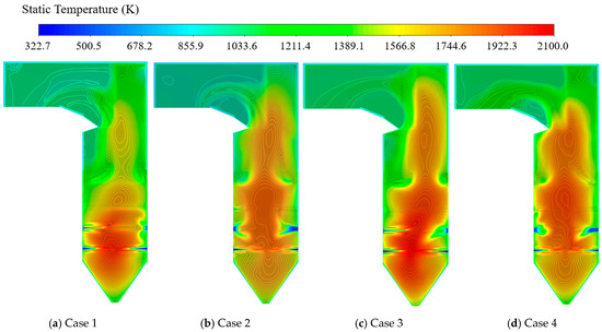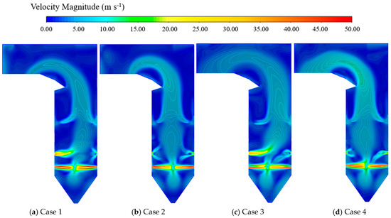 Figure 5 visually represents the distribution characteristics of the airflow within the furnace when the boiler runs under different working conditions. The figure indicates that the flow field in the boiler generally presents a symmetrical distribution. The convergence of the airflow originating from the strategically positioned burners occurs centrally, subsequently ascending vertically throughout the entire height of the furnace. The pulverized coal flow from the lower burners partly moves downward after the convergence at the core of the furnace, thus forming a region with a higher air velocity in the ash hopper. To prompt the combustion of pulverized coal, the OFA, which accounts for about 30% of the total air volume, enters from the upper part of the furnace. The OFA could penetrate the flue gas smoothly to the middle of the furnace due to its high wind speed and strong airflow rigidity. Above the arch nose, the flue gas velocity decreases sharply, and backflow occurs [31,37].