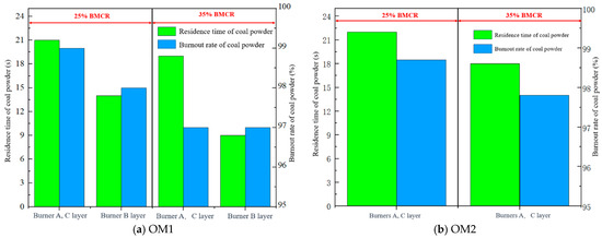 As is evident in Figure 6, the duration of the pulverized coal’s presence within the furnace through the lower-level burners is significantly longer than that of the coal injected from the middle-level burners. Taking the boiler operating at 25% BMCR with OM1 as an example, the pulverized coal that is injected via the lower-level burners maintains its presence within the furnace for a duration of 21 s, while the corresponding duration for the coal from the middle-level burners is 14 s. Due to the longer heating path experienced by the pulverized coal emanating from the lower-level burners, its burnout rate (reaches 99.4%) is also higher. The duration of the pulverized coal’s presence within the furnace decreases due to the rise in the flue gas volume as the operating load of the boiler increases [26]. However, since the temperature level within the furnace also elevates correspondingly, the burnout rate of the pulverized coal is not significantly impacted. Although there is a tendency for more pulverized coal to move towards the ash hopper when OM2 is adopted, the variation in the burnout rate of the pulverized coal is under 1%.