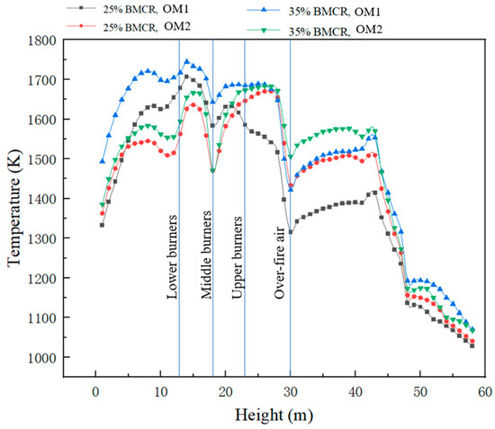 The introduction of OFA into the furnace ensures the continued combustion of the unburned pulverized coal, resulting in a subsequent increase in the furnace temperature along the height direction [38]. Figure 8 illustrates the influence that various operation modes exert on the temperature throughout the furnace. The average temperature (taking the boiler running with OM2 at 35% BMCR as an example) rapidly increases in the ash hopper (0~10 m), and reaches a peak temperature at around a 9 m height. The temperature increases dramatically as the coal powder is injected by each layer of burners, reaching a peak temperature between adjacent layers of burners, with a temperature of about 1730 K at a height of about 15 m. The OFA, comprising 28% of the total air volume, enters the furnace, causing a reduction in the temperature to 1400 K and compressing the flame in the upper portion. Subsequently, the temperature increases anew as the remaining unburnt carbon undergoes further combustion.