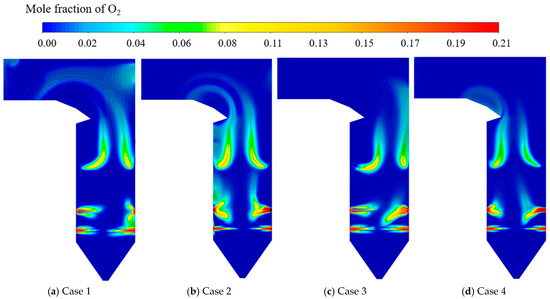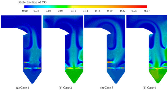 The distribution of CO and O2 exhibits an inverse pattern [13]. This can be observed by comparing the distribution of O2, as revealed in Figure 9, and the distribution of CO, as shown in Figure 11. The body of previous work has highlighted the fact that the concentration of CO inside the furnace is mainly determined by three factors: the combustion of volatiles producing CO, the combustion of coke producing CO, and CO consumption through oxidation. Among these, the rates of CO generation from volatile combustion and CO oxidation are much higher than the rate of CO generation from coke combustion. Therefore, the distribution of CO inside the furnace depends mainly on the rates of volatile combustion and CO oxidation, both of which are strongly correlated with the distribution of O2 [41].