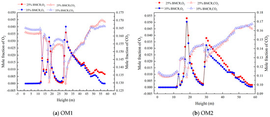 The distribution of O2 in the furnace makes a notable difference to the combustion and heat transfer of coal powder and the complete combustion of coke [13]. In addition, the O2 atmosphere also affects the emission characteristics of pollutants [37]. The distribution of O2 shown in Figure 9 reveals that when the boiler is operating at a low load, the lower swirl intensity and lower secondary air volume hinder the formation of a good aerodynamic field for the stable combustion and reduction of NOx. Figure 10 shows the mole fraction changes in O2 and CO2 in cross-sections along the height of the furnace. In general, O2 and CO2 show opposite distributions, and when the same operating mode is applied, the component distribution in the furnace are generally similar at different loads, reaching a peak at the burner nozzle and then sharply increasing with the combustion of coal powder. Figure 10a with Figure 10b could reveal that the CO2 content in the ash hopper area is much higher (the CO2 content in the ash hopper area of the boiler operating under OM1 is 4 times that of OM2) in OM1 than that in OM2. This is because the resistance of the coal powder flow from the lower burners is greater in OM1, leading to more coal powder burning in the ash hopper. However, the ash hopper does not receive sufficient oxygen replenishment, which could lead to the incomplete combustion of the pulverized coal [13,40].