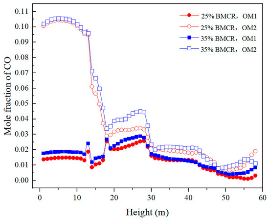 Boilers operating under the OM1 condition reduce the quantity of pulverized coal injected by each burner and promote the mixing of pulverized coal and air to a certain extent, which results in less CO produced in the main combustion zone. OFA enters the furnace and provides the O2 needed for the combustion of coke and promoting the oxidation and consumption of CO, leading to a sharp decrease in the CO content, as elegantly illustrated in Figure 12 [16,30]. The mole fraction of CO in the ash hopper reaches 0.108 when the boiler employs OM2, whereas this value is merely 0.015 when the boiler adopts OM1. This fact corresponds with the previously mentioned finding, where the application of OM2 results in the emission of more pulverized coal from a single burner nozzle, hindering the full mixing of pulverized coal and air.