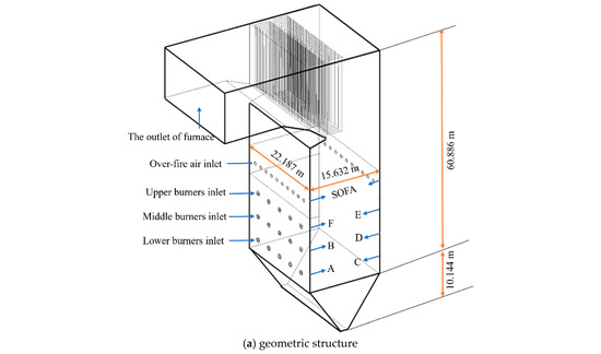 Based on the mode of combustion arrangement, coal-fired boilers, which are widely utilized in China, are typically categorized into wall-fired, tangentially fired, and down-fired boilers [14]. Several types of boilers are prevalent, notably wall-fired boilers, which are favored for their advantages such as enhanced stability during low-load combustion and reduced temperature variations in the horizontal flue gas pass [15,16,17]. Operating a boiler at 70%~100% boiler maximum continuous rating (BMCR) is generally considered optimal. When operating below this range, the boiler is referred as being under low-load conditions. In such scenarios, the boiler performance deteriorates significantly, leading to a series of issues including decreased combustion stability [18,19]. Therefore, the combustion characteristics and NOx emissions of wall-fired boilers under reduced operational loads have garnered extensive attention [20,21,22,23]. Measures such as stopping the operation of certain burners are often adopted to ensure that each burner operates within a reasonable range when the operating load of the boiler decreases. During the low-load operation of the boiler, solely relying on the upper burners could cause combustion instability, whereas employing the lower burners increases the dwell time of pulverized coal inside the furnace, which subsequently prompts its burnout [24,25,26]. As the boiler load decreases, both the fuel and airflow rates decrease. When the boiler operates at 20% to 50% BMCR, it is common to apply a method of operating two or three layers of burners located in the lower part of the furnace. Operating fewer layers of burners means that each burner sprays more coal powder, which is not conducive to the complete combustion of the coal powder. On the other hand, using more layers of burners can result in unavoidable flame skewing, which may cause excessive thermal load deviation on the water-cooled wall, potentially affecting the safe operation of the boiler [20]. The velocity of over-fire air (OFA) plays a crucial role in influencing the combustion behavior of the boiler. As evidenced by previous studies [27,28], it can profoundly reduce the generation NOx when the OFA rate is approximately 0.2 to 0.3. However, this results in an under-oxygenated combustion state for the pulverized coal in the burner area, consequently leading to the generation of CO in that region. In addition, the air sprayed by the burners is separated into the central air and inner and outer secondary air to entering the furnace, which delays the mixing of the coal powder and secondary air and increasing the generation of CO. Historically, lower demands for the peak shaving capability in power plants is required. Previous investigations [13,29,30] have often focused on work conditions above 40% BMCR and have usually applied a single-burner operation mode. As the boiler load decreased progressively, these studies have illuminated the combustion behaviors exhibited by boilers. However, foundational research [31,32] on the combustion mechanism of pulverized coal during the operation of boilers with different burner configurations at extremely low loads (especially when the boiler load falls below 40% BMCR) has still been limited.