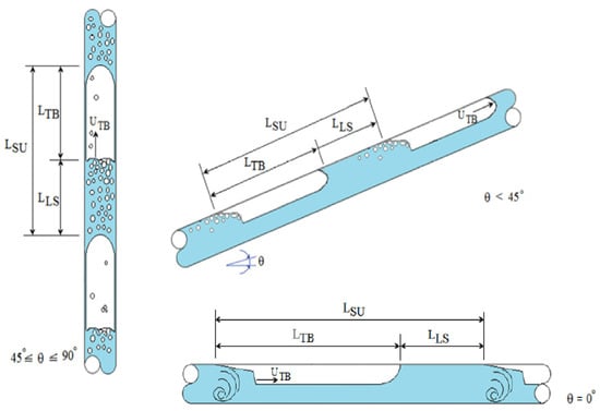 The multiphase flow in pipes, especially the gas–liquid two-phase, has been intensively studied. This can be explained by their occurrence in several industrial systems such as petroleum and gas production, power generation, airlift pumping, heat exchangers, chemical processing, aerospace engineering, paper production, and medical devices [1,2,3,4,5]. The main characteristic of these flows is the presence of several flow regimes or flow patterns [6]. The existence region of each flow regime can be detected using flow transition models or flow maps [7]. The slug flow, or intermittent flow, refers to the flow regime where two flow structures (liquid slug and elongated bubble) flow alternatively, as shown in Figure 1 taken from [8]. A slug unit is constituted by a liquid slug and an elongated bubble. As shown in Figure 1, the elongated bubbles flow over the liquid film horizontally, and where the pipe inclination is below 45°. For θ ≥ 45° and due to the effect of buoyancy, the elongated bubbles flow in the center of the pipe surrounded by the liquid film. Note that the elongated bubble is referred to as a Taylor bubble in these cases. In Figure 1, UTB, LLS, LTB, and LSU refer to the translational velocity of the elongated bubble, liquid slug length, elongated bubble length, and slug unit length, respectively. The slug flow occurs in all multiphase systems constituted by one gas and one liquid at least. This flow regime is characterized by intrinsic parameters, such as slug frequency (SF). This refers to the number of liquid slugs passing by one point during a fixed time period.