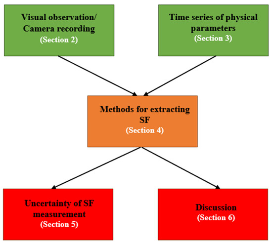 This review paper aims to fill this gap through a presentation and discussion of the existing knowledge on the different instruments, techniques, and methods developed and employed for measuring SF. The paper is structured in three levels following the flow diagram shown in Figure 2. At the first level, the two main categories of the instruments used for measuring will be discussed. Section 2 and Section 3 are devoted to the visual observation/recording and flow parameters time series, respectively. From the video recording and time series signals, several methods were applied to extract SF. This part, summarized in Section 4, constitutes the second level. The third level is devoted to discussing the uncertainty in SF measurements (Section 5) and the results obtained from different instrumentation/techniques and methods (Section 6). Section 7 is committed to presenting the main conclusions as well as recommendations for future research.