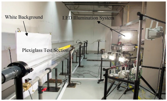 Example of illumination system used for camera video recordings used by Mohmmed et al. [22]. Reprinted from International Journal of Pressure Vessels and Piping, vol. 172, Abdalellah O. Mohmmed, Hussain H. Al-Kayiem, Mohammad S. Nasif, Rune W. Time, Effect of slug flow frequency on the mechanical stress behavior of pipelines, page 3, Copyright © 2019, with permission from Elsevier.