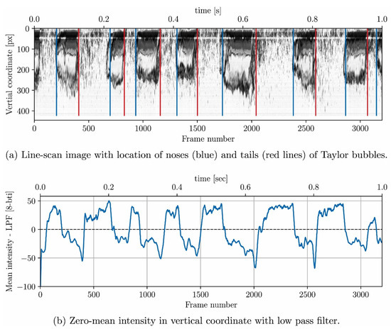 With the improvements of computer processing capacity, camera resolution, and framerate, several techniques have been used to extract quantitative flow data from video images [28]. The main efforts were performed to propose robust algorithms that are able to detect the elongated bubble/liquid slug interfaces, which deform and move continuously [29]. For instance, Sassi et al. [17] developed the line-scan image (LSI) method to extract the time series of interfaces from videos. First, videos were recorded using a fast camera with a resolution of 1 × 640 pixels in the axial and vertical directions, respectively, during a time of 75 s, which corresponds to a total of 240,000 frames for each run. Then, the contrast of each image was enhanced through a pre-processing step involving background subtraction and histogram stretching. The line-scan image was obtained by positioning all the images sequentially, forming an image of 240,000 × 640 pixels. The noses and tails of both slug flow structures can be easily shown in the obtained line-scan image, as it appears in Figure 4a. Furthermore, a calculation of the mean intensity in the vertical axis was performed, which gives a time series of the mean intensity when the interface of elongated bubbles and liquid slugs can be easily identified (Figure 4b). A relatively similar technique was employed in Porter et al. [28].