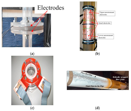Examples of (a) conductance probe; (b) ECT; (c) WMS used in Zhao et al. [86] (Copyright ©2016, Zhao et al.); and (d) wrapped fiber cable of distributed acoustic sensing (DAS) used by Ali et al. [8] (Copyright ©2024, Ali et al.).