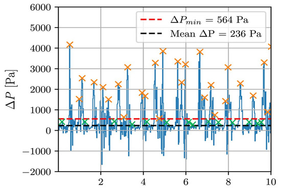 Example of pressure drop time series showing the peaks induced by the passage of liquid slugs (orange crosses) and by the presence of different kinds of flow structures (waves, roll waves or pseudo slugs) (green crosses). Copyright ©2022, Sassi et al. Note that the green crosses are added and not part of the original source.