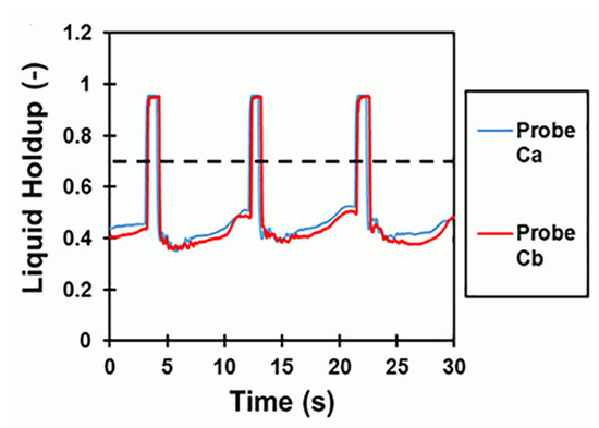 To overcome the weakness of the camera recording, explained in Section 2, several researchers have used and/or developed specific techniques to detect the passage of the liquid slugs and elongated bubbles [36,37]. This can be achieved by collecting the temporal signals of parameters that are “sensitive” to the passage of liquid slugs and elongated bubble interfaces. Furthermore, the passage of liquid slugs and elongated bubbles induces important differences in the values of some physical parameters, as shown in Figure 5, with a void fraction time series. In addition, the obtained time series allows us to quantify the number of liquid slugs passing.