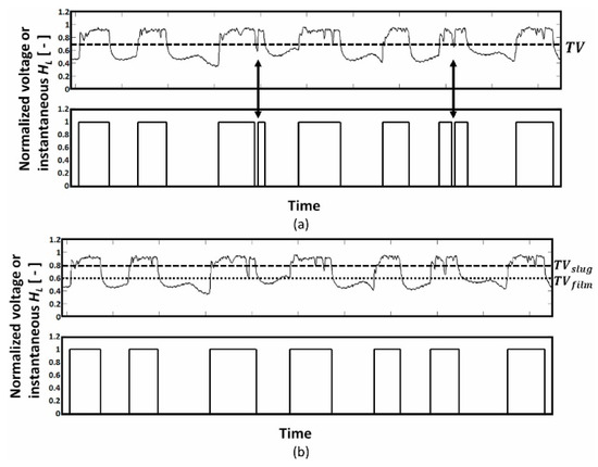 Some researchers preferred to binarize the obtained time series in order to obtain square signals with only two values: 0 and 1. This technique is notably used for extracting the liquid slug (Ls) and elongated bubble (Leb) lengths. In his PhD thesis, Kouba [48] binarized the time series of liquid holdup using a threshold value. Each point of the time series that is superior to the threshold values becomes 1, otherwise, it is assigned a value of zero. The threshold value is chosen subjectively depending on the time series trace; i.e., for each signal (and thus for each experimental condition), a specific TV is selected. Examples of the original signal (a) and binarization signals are given in Figure 9a. Losi et al. [54], Rosas et al. [89], Babakhani Dehkordi et al. [43], and Rodrigues et al. [87,90] employed this method. These works were carried out for horizontal and slightly horizontal pipes. Mi et al. [67] applied this technique for the case of vertical pipe, but there are no details about how the binarization was performed.