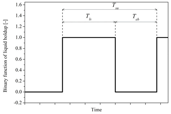 Similarly, some authors extracted from time series the translational or residence time of the slug unit (Tsu) given by Equation (8), which is the time needed for a slug unit to pass through a certain cross-section [5,29,85,87,90]. Thus, it is the sum of the translational times of the elongated bubble (Teb) and of the liquid slug (Tls), as depicted in Figure 10.