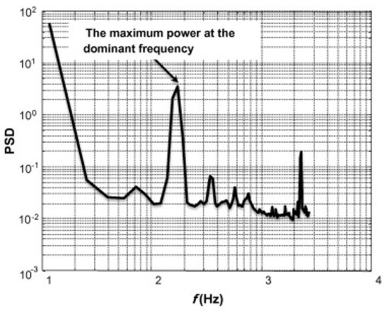 SF can be estimated from the frequency spectrum obtained using the power spectral density. This mathematical tool allows detecting the frequencies present in a time series and assigning them to various physical phenomena in a system [139]. The PSD can be obtained by applying the Fast Fourier Transform (FFT) algorithm to the autocorrelation of a time series [7,15,71,123,140]. An example of PSD is given in Figure 11. The frequency corresponding to the higher PSD value is termed the dominant frequency, while the other peaks result from the presence of harmonic frequencies [15,51]. Traditionally, the dominant frequency is usually associated with SF [15,26,51,75,141,142]. Schmelter et al. [129] explained that computing PSD from the Welch method gives more robust results than a pure FFT. This is due to the additional smoothing performed by the Welch method, which allows better highlighting the desired phenomenon (SF in this case) [143].