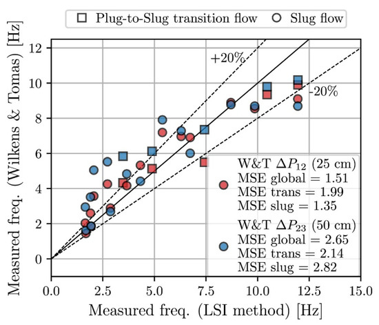 Comparison between the measured slug frequency using W&M method applied for two pressure tap distances and LSI method obtained by Sassi et al. [17]. Copyright © 2022, Paulo Sassi et al.