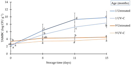 The effect of ultraviolet-C (UV-C) treatment on the total aerobic mesophilic bacteria count (TAMBC) in raw fresh-cut potatoes (FCP) depending on the age of the tubers (months) and storage period (days) of the FCP is shown in Figure 1.