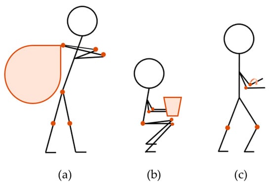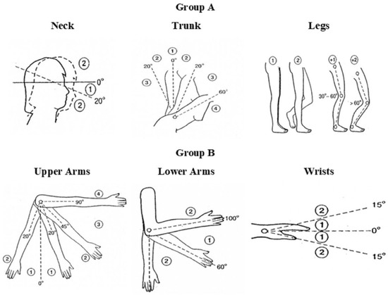 20]. By way of example, if a worker, while conducting their task, is bent over, with both arms below their shoulders, kneeling and unladen, their level of risk will be the maximum level, i.e., level 4.
