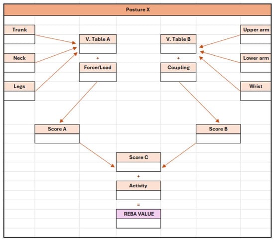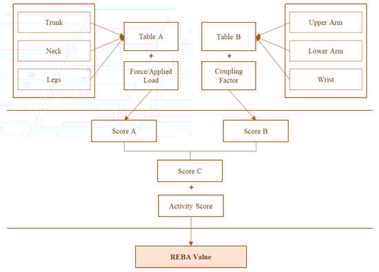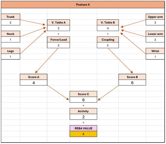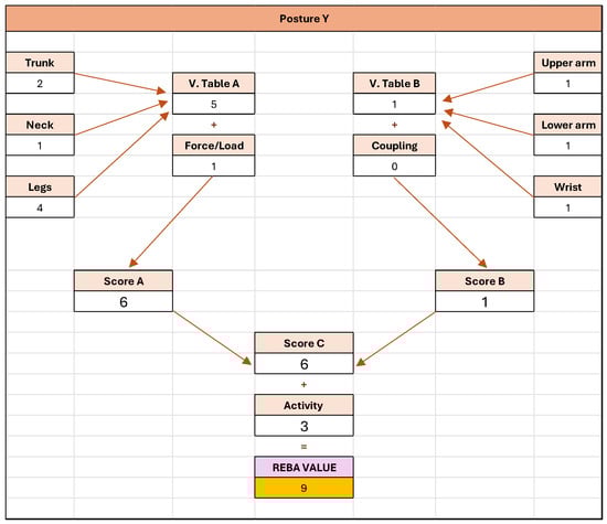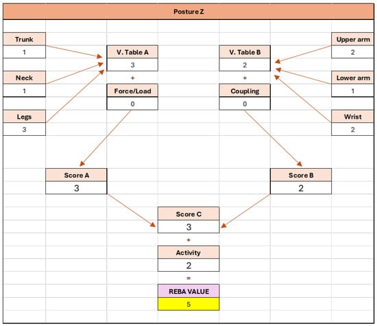 Figure 8, the REBA value assigned to posture Z was 5, which is considered to present a medium level of ergonomic risk, where corrective action will be required in the future.