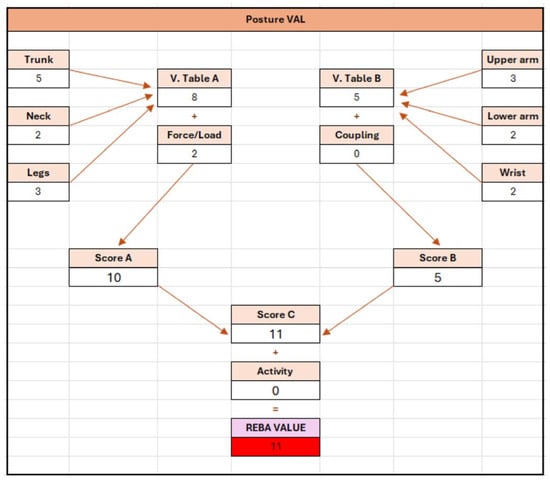 Figure 9, the REBA result obtained by the decision support system developed is equal to the value resulting from the application of the scientific article. In fact, this type of posture is extremely harmful to workers’ health, as the level of ergonomic risk is very high, requiring immediate action at action level 4.