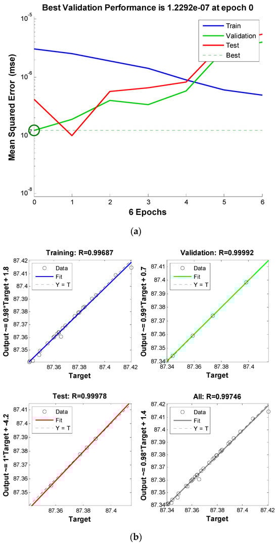 The results are shown in Table 2. They reveal that the MC changed with a changing EC. The maximum experimental MC was 87.40851% at an EC of 0.588196 S/m—higher electrical conductivity results from more free ions being available for conduction when moisture rises. Also, Table 2 depicts that the experimental and predicted MCs using ANNs converged, and the SSE and RMSE were inclined. The ANN is superior to other modeling methods because it uses experimental data to create a highly accurate model and address issues associated with the food processing industry [22]. At the same time, an R value of 0.951 was observed. For the ANN performance (Figure 4), the best validation performance was 2.1437 × 10−5 at epoch one, and the R values for training, validation, and testing all ranged between 0.8402 and 0.99452. Therefore, the MC of pasteurized milk can be predicted by a sixth-order polynomial model based on the EC as given in Equation (5):