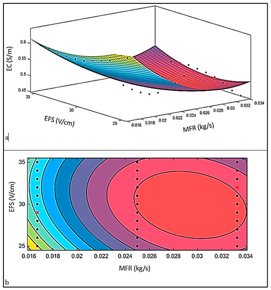Table 1 shows the effect of the EFS and MFR on the EC during milk pasteurization by NP at 35 °C. The results reveal that the EC increased as the MFR decreased. When the MFR was reduced from 0.0333 to 0.0167 kg/s, the EC rose from 0.457441 to 0.638224 S/m, respectively. This is because of the increase in the residence time due to the decreased speed of milk at a lower MFR, which permits the passage of higher current, leading to a rise in EC according to Equation (1). The residence period of milk in the MEF was found to be significantly shortened with an increase in MFR at all EFS values [23]. The researchers also found that this result was associated with increased milk speed at a higher MFR. EC changed with the increasing EFS. For instance, EC increased from 0.457441 to 0.503529 when the EFS rose from 25 to 31 V/cm at a 0.0333 kg/s MFR, and then decreased to 0.501187, 0.497532 S/m, and 0.49191 S/m at 32, 33, and 34 V/cm, respectively. The maximum value of EC reached 0.596071 S/m at an EFS of 35 V/cm and MFR of 0.0167 kg/s. The change in EC with the EFS is because pasteurized milk’s conductivity can rise as the strength of the electric field increases because of temperature effects and increased ionic mobility.