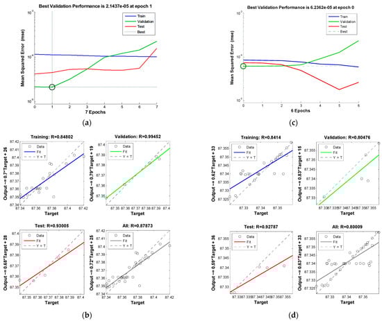 Visual representation of ANN performance; (a): mean square error (MSE) of pasteurized milk; (b): correlation coefficients (R) of pasteurized milk; (c): MSE of raw milk; (d): R of raw milk. The target is the experimental MC, and the output is the predicted MC.