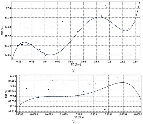 The predicted moisture content (MC) vs. electrical conductivity (EC) curves of pasteurized (a) and raw milk (b).