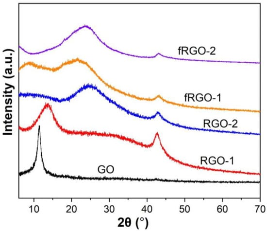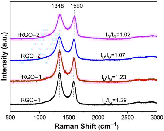 As shown in Figure 3, RGO-1, RGO-2, fRGO-1 and fRGO-2 all have two strong peaks at 1348 and 1590 cm−1, corresponding to the D and G bands of graphene, respectively. The G band is principally related to the in-plane bond stretching of sp2 C atoms, while the D band is ascribed to defects or lattice distortion. The intensity ratio of D and G band (ID/IG) reflects the graphitic degree. Compared with the ID/IG (1.29) value of RGO-1, the ID/IG (1.07) value of RGO-2 is smaller, which proves that RGO-2 is better reduced. And fRGO-1 and fRGO-2 have a slightly lower ID/IG values of 1.23 and 1.02 than RGO-1 and RGO-2, respectively.- The result is a combination of the partial restoration of graphitic structure at high temperature during interlayer modification [,] and the presence of grafted functional groups at the edges or on the surface of RGO, with the former enhancing structure and the latter potentially causing more defects. The restoration of the graphitic structure is the more significant factor, leading to an increased graphitic degree in fRGO-1 and fRGO-2 after functionalization.
