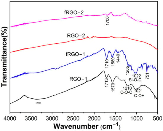 FTIR spectra of RGO-1, RGO-2, fRGO-1 and fRGO-2.
